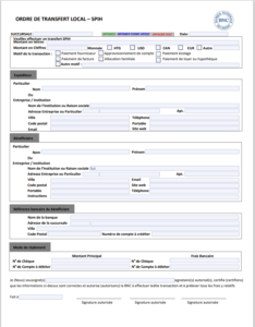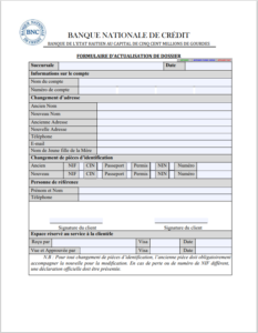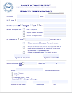 Ouverture de compte d’entreprise Ouverture de compte de particuliers Actualisation de dossier Arrêt de paiement Réquisition de chéquiers Achat de chèque de Direction Achat de chèque sur l’étranger Credit PME Formulaire d’actualisation de dossier Formulaire d’Application Carte prepaid BNC Formulaire d’Application La Carte BNC Formulaire de Bilan Personnel Formulaire de Crédit Formulaire de Réquisition de chèque sur l’étranger FORMULAIRE DE TRANSFERT LOCAL CLI_Dollars FORMULAIRE DE TRANSFERT LOCAL CLI_Gourdes Ordre de Transfert local SPIH Perte de Document PROGRAMME DE CRÉDIT AU BÉNÉFICE DES AGENTS DE LA FONCTION PUBLIQUE